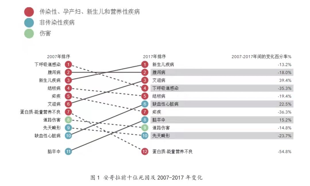 除了新生儿疾病之外,腹泻病、艾滋病、下呼吸道感染和结核病也是排在前五的致死原因。除了传染性疾病以外,非传染性疾病如缺血性心脏病和脑卒中造成的死亡也呈现攀升趋势,显示了该国也受到非传染性疾病的困扰。