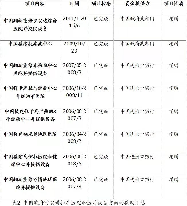 就以上援助项目来看,中国对安哥拉的医疗援助主要集中在医疗中心援建、设备捐赠等基础设施的援助,但同时也通过药物、资金及人员的援助推动当地医疗卫生的发展。