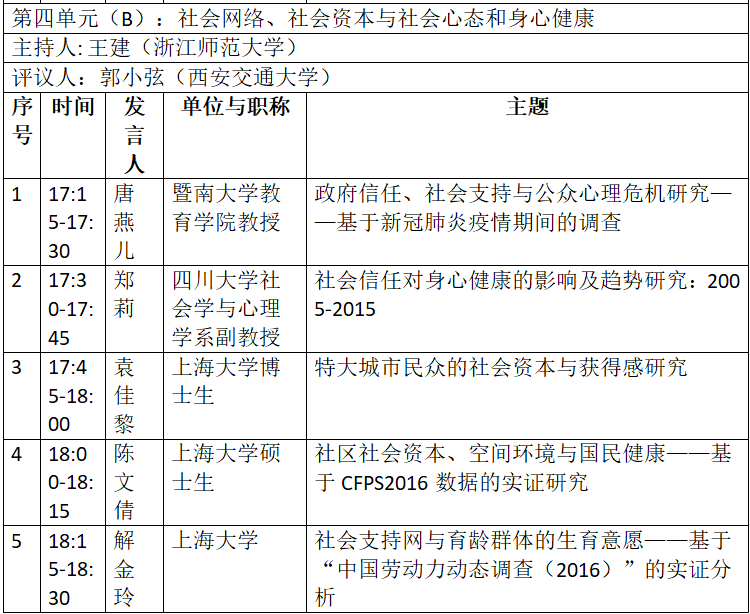 平行论坛B:社会资本与社会网络理论、方法、效用与社会心态、身心健康影响(会议ID:689 111 946)