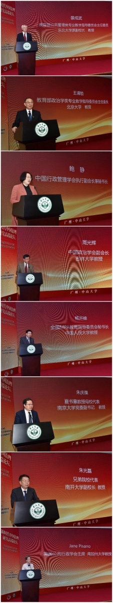 教育部公共管理类专业教学指导委员会主任委员、东北大学娄成武教授,教育部政治学类专业教学指导委员会主任委员、北京大学王浦劬教授,中国行政管理学会执行副会长兼秘书长鲍静,中国政治学会副会长、吉林大学周光辉教授,全国MPA教育指导委员会秘书长、中国人民大学杨开锋教授,夏书章教授母校代表、南京大学党委副书记朱庆葆教授,兄弟院校代表、南开大学副校长朱光磊教授,美国公共行政学会会长、南加州大学Jane Pisano教授,代表学界致辞。大家一致赞扬夏书章教授对中国公共管理与政治学发展的卓越贡献,并对夏书章教授认真严谨的学术精神,谦和宽厚的学者风范,匡扶后辈的教育情怀,表示崇高的敬意。