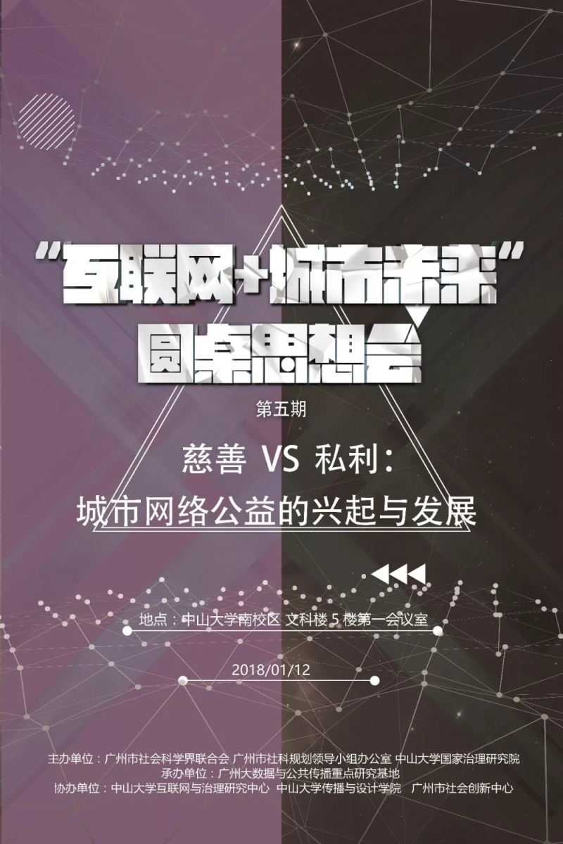 由广州市社会科学界联合会、广州市社科规划领导小组办公室、中山大学国家治理研究院联合举办,广州大数据与公共传播重点研究基地承办的“互联网+城市未来”圆桌思想会(第五期)“慈善vs. 私利:城市网络公益的兴起与发展”定于2018年1月12日在广州中山大学举办。