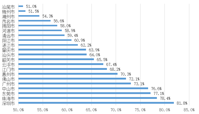 图10 广东省21个地级市受访者社会保险参保率对比(%)