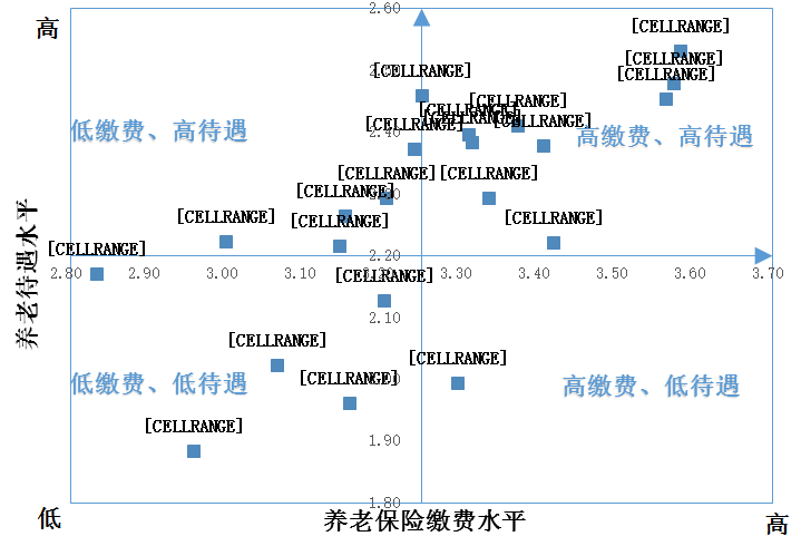 注:图中数值为平均值。横轴表示“养老保险缴费水平”,数值从左往右逐渐递增,题项提问“您认为当地的养老保险缴费水平是太高、有点高、刚刚好、有点低还是太低?”。重新编码后,令选项太低=1,有点低=2,刚刚好=3,有点高=4,太高=5,均值越高表示当地养老保险缴费水平越高,公众缴费负担感越强;纵轴表示“养老待遇水平”,题项提问“您认为当地的养老待遇是太高、有点高、刚刚好、有点低还是太低?”。重新编码后,令选项太低=1,有点低=2,刚刚好=3,有点高=4,太高=5,均值越高表示当地养老待遇水平越高,公众获得感越强。由此区分出“高缴费高待遇”,“低缴费低待遇”,“高缴费低待遇”,“低缴费高待遇”四个象限。