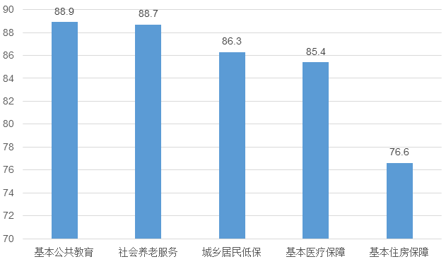 注:图中蓝色柱状图数值为百分比,表示在“基本公共教育”、“社会养老服务”、“城乡居民低保”、“基本医疗保障”、“基本住房保障”各项民生支出中,认为应“大幅增加投入”和“适度增加投入”的受访者比率,比率越大表示对该项民生支出的呼声越高。