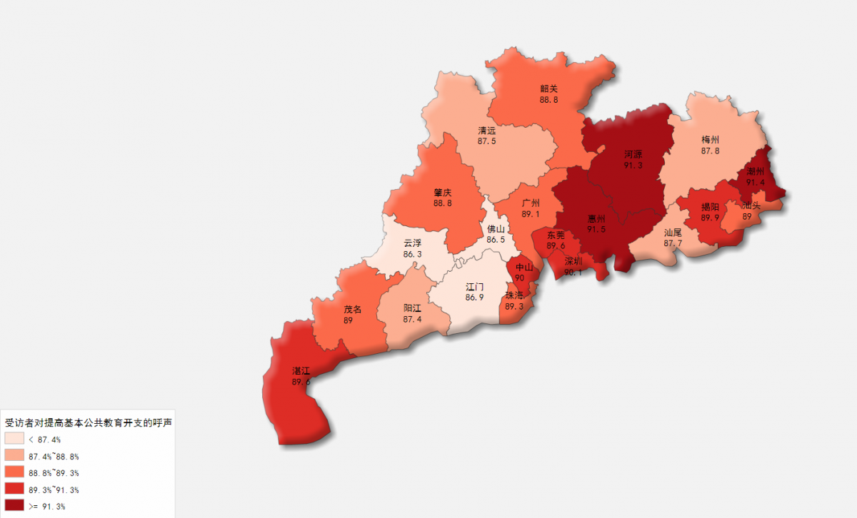 注:图中数值为百分比,表示认为应对基本公共教育开支“大幅增加投入”和“适度增加投入”的受访者比率,比率越大表示呼声越高,即图中颜色越深表示该地区公众对提高基本公共教育开支的诉求越大。