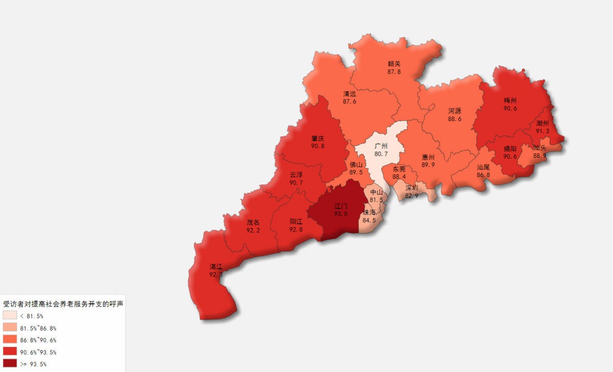 注:图中数值为百分比,表示认为应对社会养老服务开支“大幅增加投入”和“适度增加投入”的受访者比率,比率越大表示呼声越高,即图中颜色越深表示该地区公众对提高社会养老服务开支的诉求越大。