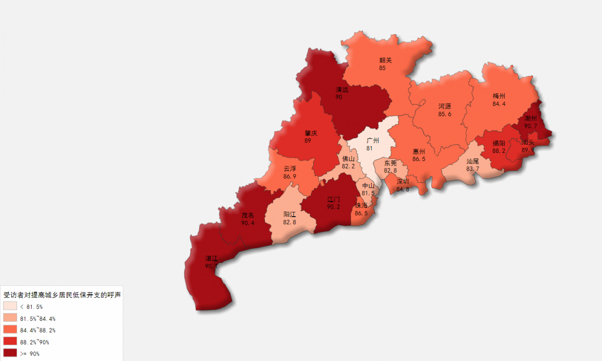 注:图中数值为百分比,表示认为应对城乡居民低保开支“大幅增加投入”和“适度增加投入”的受访者比率,比率越大表示呼声越高,即图中颜色越深表示该地区公众对提高城乡居民低保开支的诉求越大。