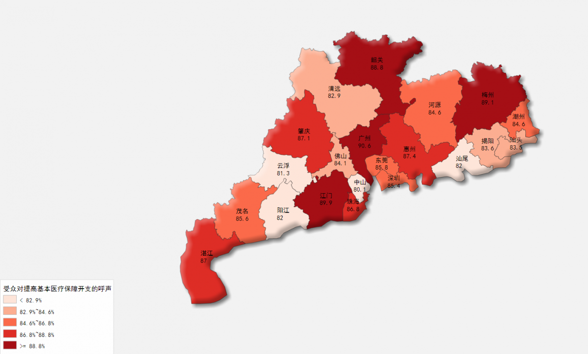 注:图中数值为百分比,表示认为应对基本医疗保障开支“大幅增加投入”和“适度增加投入”的受访者比率,比率越大表示呼声越高,即图中颜色越深表示该地区公众对提高基本医疗保障开支的诉求越大。