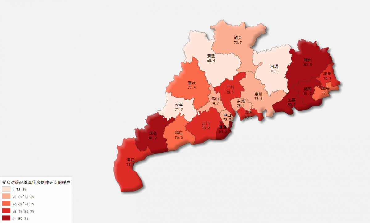注:图中数值为百分比,表示认为应对基本住房保障开支“大幅增加投入”和“适度增加投入”的受访者比率,比率越大表示呼声越高,即图中颜色越深表示该地区公众对提高基本住房保障开支的诉求越大。