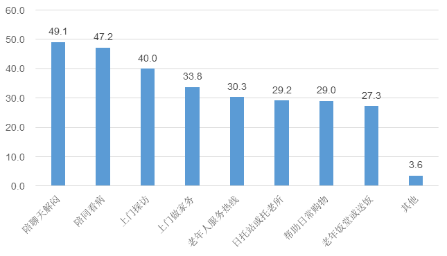 注:图中蓝色柱状图数值为百分比,表示选择“陪聊天解闷”、“陪同看病”、“上门探访”、“上门做家务”、“老年人服务热线”、“日托站或托老所”、“帮助日常购物”、“老年饭堂或送饭”或“其他”等作为对家里老人照顾最需要的社会支持的受访者比率。