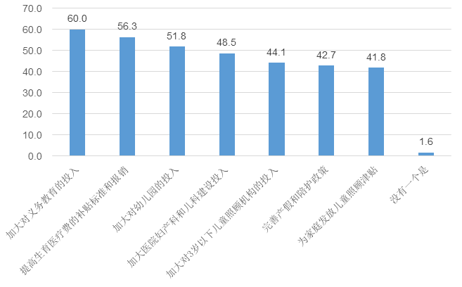 注:图中蓝色柱状图数值为百分比,表示选择“加大对义务教育的投入”、“提高生育医疗费的补贴标准和报销”、“加大对幼儿园的投入”、“加大医院妇产科和儿科建设投入”、“加大对3岁以下儿童照顾机构的投入”、“完善产假和陪护政策”、“为家庭发放儿童照顾津贴”或“没有一个是”作为对“全面放开二孩”政策最需要的配套措施的受访者比率。