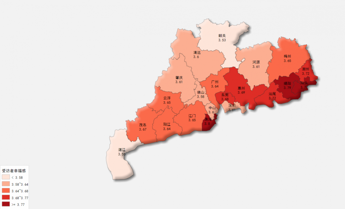 注:图中数值为平均值,题项提问“请您告诉我您觉得您的生活是非常不幸福、比较不幸福、说不上幸福不幸福、比较幸福还是非常幸福?”。重新编码后,令选项非常不幸福=1,比较不幸福=2,说不上幸福不幸福=3,比较幸福=4,非常幸福=5。根据各地级市受访者的回答情况,按照重新编码后的结果计算出均值,均值越高表示受访者的幸福感越强,即图中颜色越深表示该地区公众的幸福感越强。