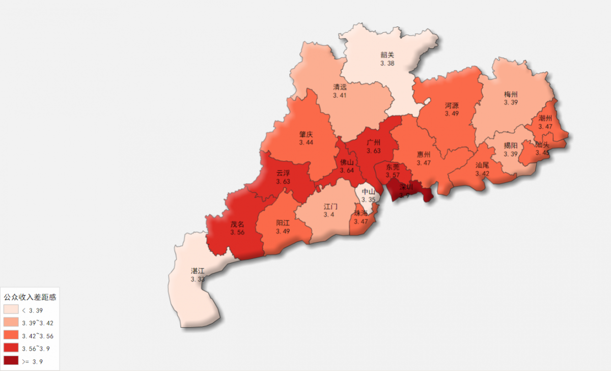 注:图中数值为平均值,题项提问“您认为您当地的收入差距是非常小、比较小、一般、比较大还是非常大?”。重新编码后,令选项非常小=1,比较小=2,一般=3,比较大=4,非常大=5,根据各地级市受访者的回答情况,按照重新编码后的结果计算出均值,均值越高表示受访者的收入差距感越强,即图中颜色越深表示该地区公众的收入差距感越强。