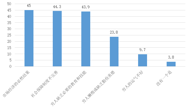 注:图中蓝色柱状图的数值为百分比。表示受访者选择“市场经济的必然结果”、“社会保障制度不完善”、“穷人缺乏必要的教育和技能”、“穷人懒惰或缺乏勤俭美德”、“穷人的运气不好”等作为致贫原因的频率,频率越高表示有更多的受访者将其作为导致贫困的原因。