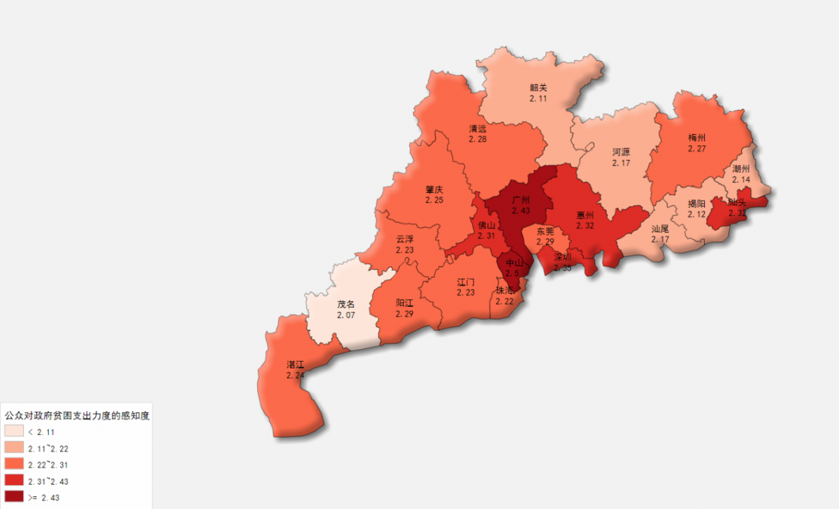 注:图中数值为平均值。题项提问“您认为 市的政府在救助穷人方面花的钱是非常多、比较多、刚刚好、比较少还是非常少?”。重新编码后,令选项非常少=1,比较少=2,刚刚好=3,比较多=4,非常多=5,根据各地级市受访者的回答情况,按照重新编码后的结果计算出均值,均值越高表示受访者对政府贫困支出力度的感知度越强,即图中颜色越深表示该地区公众对政府贫困支出力度的感知度越强。