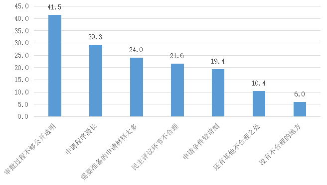 注:图中蓝色柱状图的数值为百分比,表示认为低保申请程序的不合理之处在于“审批过程不够公开透明”、“申请程序漫长”、“需要准备的申请材料太多”、“民主评议环节不合理”、“申请条件较苛刻”或认为“还有其他不合理之处”和“没有不合理之处”的受访者比率。