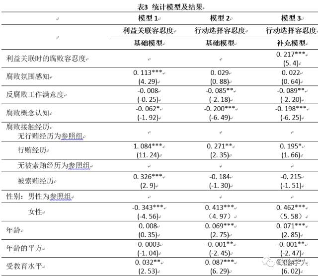 注:括号内为t统计值;*p<0. 1, ** p<0. 05, *** p<0. 01,采用县市区聚类稳健标准误估计。模型2和3只是针对那些没有遇到过腐败行为的受访者,故观测值比模型1少1000个左右。本次调查显示,有1524个受访者表示遇到过腐败行为,占比为22%。