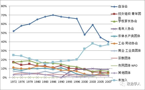 日本学者辻中丰(2014)指出了自治会作为公民社会组织的几个特点:(1)其数量在日本公民社会组织中最为庞大。据2008年的统计数据,日本全国有特定非营利法人(NPO)、财团法人、社团法人、宗教法人、经济团体、业界团体、农协等各种公民社会组织约有80万个。其中自治会约有30万个,分布在全国98%以上的市区町村的地方社区。因此可以说自治会遍布在日本全国的基层地方社区且数量巨大,是日本公民社会组织中最大的一个类别。(2)其入会比例是日本公民社会组织中最高的。自治会的入会原则是该地区的全部居民以家庭为单位加入,所以自治会一直保持有很高的入会比例。图1表示的是日本各种公民社会组织的入会比例,可以看出自治会相比其他公民组织,其入会比例一直独占鳌头。对于这样的特征,一些学者用“地缘团体”、“住缘团体”等概念来描述。