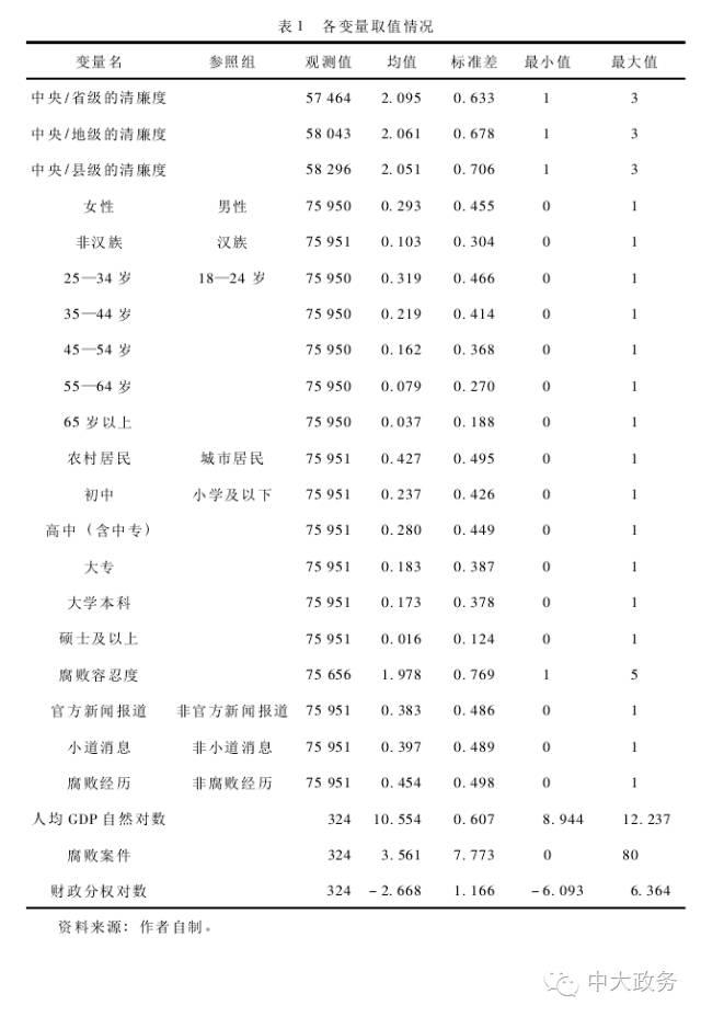 2015 年 12 月,为全面了解公众对中国各级政府清廉状况的感知水平,中山大学廉政与治理研究中心对中国大陆 31 个省级行政区 333 个地级行政区共83305 位受访者进行了电话调查。此次调查以地级行政区为抽样单位,平均每个地级行政区随机抽取样本 250 个。调查内容涵盖公众对当年各级政府的清廉感知程度、腐败的定义和容忍度、接触腐败的信息来源、反腐败意愿、反腐败工作满意度和反腐败信心等。此外,本文利用中纪委监察部官网、各地统计年鉴和政府工作报告,搜集宏观层面相关数据。需要指出的是,由于西藏自治区的