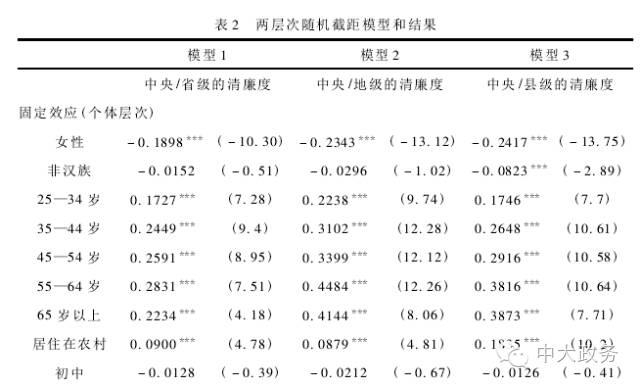 其中,i ( i ~ 1. 2…. N) 代表个体层面观测值,j ( j ~ 1. 2. 3…M) 代表独立的第二层次所有组,也就是地级行政区; 固定效应为 Xij,κ 代表 cutpoints ( 即截距) ,H ( ·) 代表 logitstic 累计概率分布函数。β 是回归系数 ( 固定效应) ,自变量被 cutpoints 体现。Z ij 是随机效应,在随机截距模型中,Z ij 变为 1, uj 代表随机截距。第一层次变量包括个体的性别、民族、年龄、居住地、学历、腐败信息和腐败容忍度; 第二层次变量包括地级行政区的人均 GDP、腐败信息和财政分权。回归分析结果见表 2。