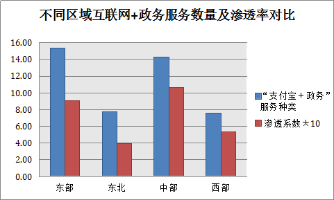 “互联网+政务“在区域间存在着巨大差异,东部和中部在服务数量和渗透度方面明显高于西部和东北。在17个东部地区城市,支付宝政务服务种类平均超过15种,平均渗透系数0.91;7个中部地区城市的服务种类接近东部为14.29种,平均渗透系数为1.07甚至超过了东部。然而西部和东北部地区明显较低:12个西部地区的平均服务种类为7.82,平均渗透系数为0.53;4个东北部地区的平均服务种类为7.75种,平均渗透系数为0.39。