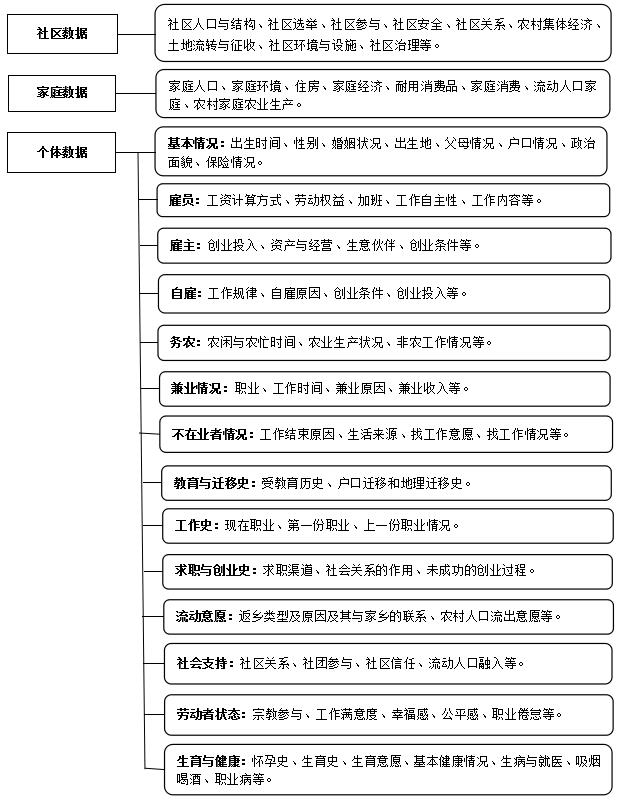 CLDS以15-64岁的劳动年龄人口为对象,以劳动力的教育、就业、劳动权益、职业流动、职业保护与健康、职业满足感和幸福感等的现状和变迁为核心。同时对劳动力所在社区的政治、经济、社会发展,对劳动力所在家庭的人口结构、家庭财产与收入、家庭消费、家庭捐赠、农村家庭生产和土地等众多议题开展了调查,是一项跨学科的大型追踪调查。