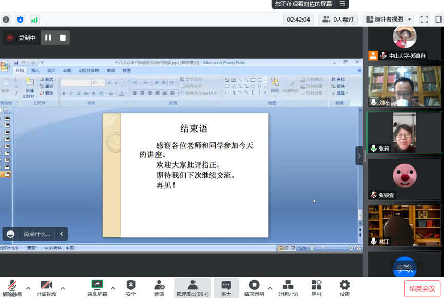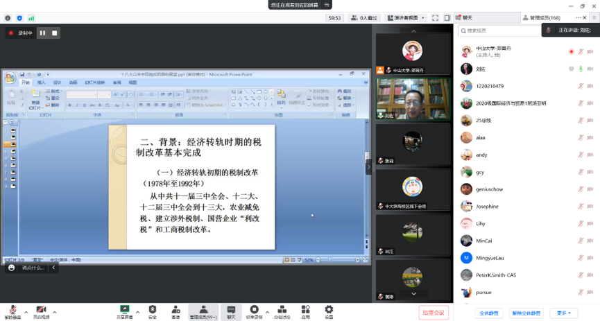 2022年11月19日星期五上午,中山大学国家治理大讲坛第二期暨现代财税政策研究中心第十一期学术研讨会在线上成功举行,本次讲座主讲嘉宾为中国法学会财税法学研究会副会长刘佐老师,讲座题目是《十八大以来中国税制改革的回顾和展望》。讲座由岭南学院林江教授主持,现代财税政策研究中心副主任张莉教授总结发言,线上线下超过百余人参与会议。